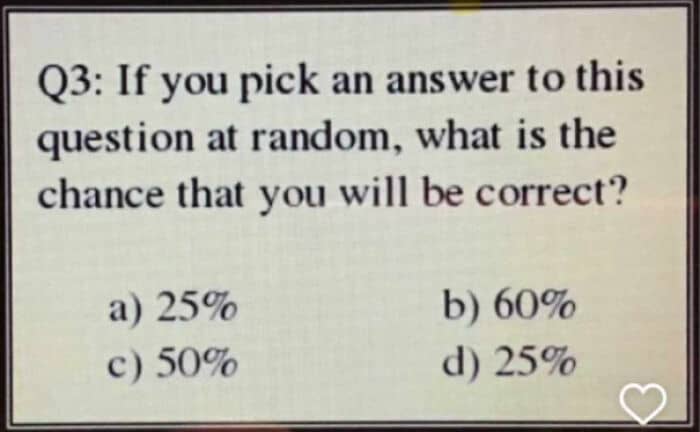 andrew_calcs: No. It’s a paradox. B is not a fraction of 4 so can never be correct in a 4 element set with discrete correct answers. For C to be correct you would need 2 elements of the set to be 50%, so C cannot be correct. For either A or D to be correct you would need 1 element of the set to be 25%. Since there are two, neither can be correct.