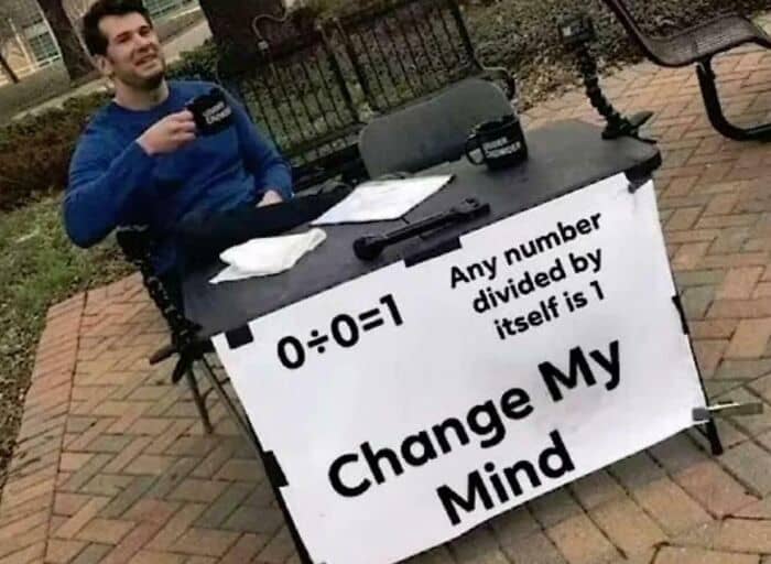 Proof by contradiction: *IF* 0/0 = 1. Then 2 * 0/0 = 2 * 1 On the left we can apply the 2 to the numerator (2 * a/b = 2a/b) so (2 * 0)/0 which equals 0/0. On the right 2 * 1 = 2. And that gives us 0/0 = 2 But we already said 0/0 =1 So now we have the result 1 = 2. Which is impossible. Therefore our original assumption must be wrong. And 0/0 does *not* = 1. By following the same logic, 0/0 can’t have *any* definite value. Or else all of the maths we use immediately breaks down. So it doesn’t.