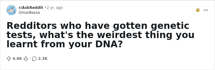 Someone asked people “who have gotten genetic tests, what’s the weirdest thing you learnt from your DNA?” and netizens posted their stories. So get comfortable as you read through, upvote your favorite stories and if you’ve done a genetic test before, share your experience in the comments down below.