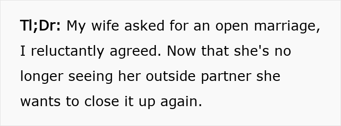But once he started settling into the arrangement and even met someone new, his wife suddenly couldn’t handle it and demanded they close the relationship again. That sparked a whole new conflict, and it didn’t stop there. Before long, it became clear it was only the tip of the iceberg, with much more going on underneath the surface. Read the full story below.