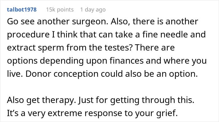 Vasectomies are reversible, contrary to what the author stated in his post. According to an article by Stanford Medicine, vasovasostomy procedures have a 90 to 95 percent success rate.