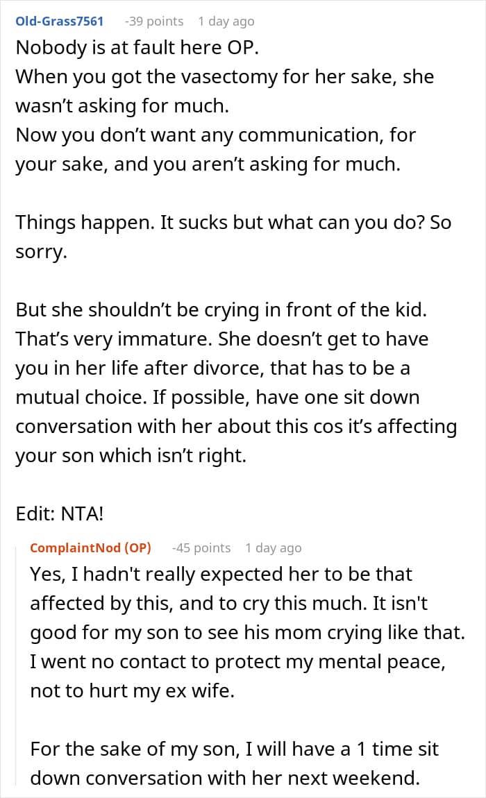 What do you think, readers? Was he out of line for cutting communication with his ex-wife/the mother of his only son?