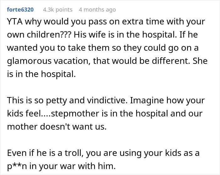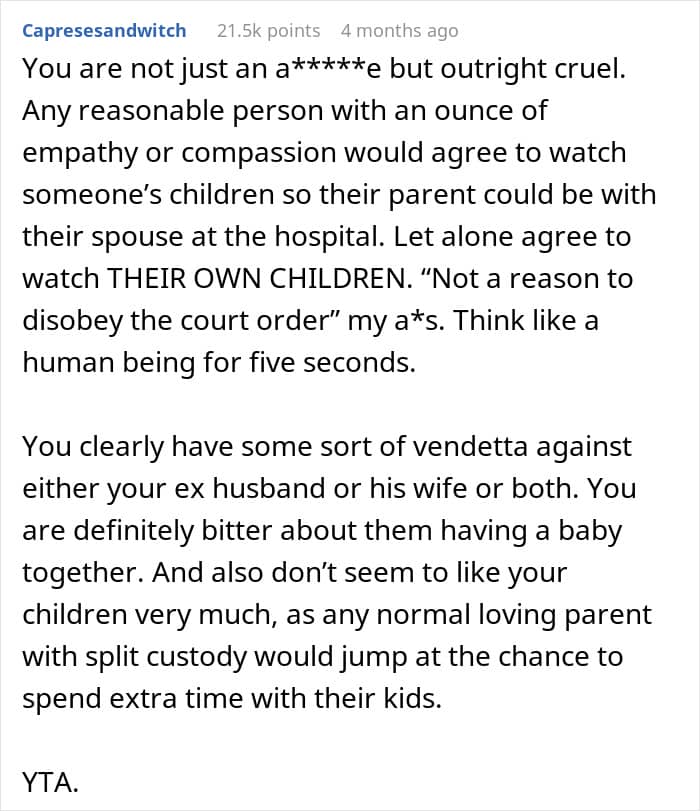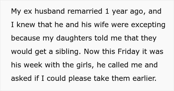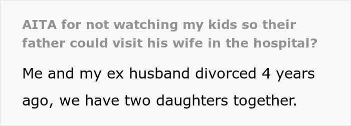In a recent post, she described a contentious situation with the father of her daughters, who requested she take the kids early so he could accompany his new wife to the hospital — and the reason behind her refusal to do so.