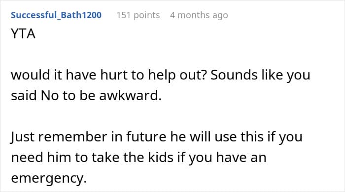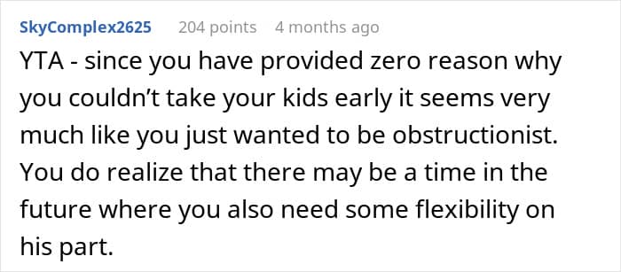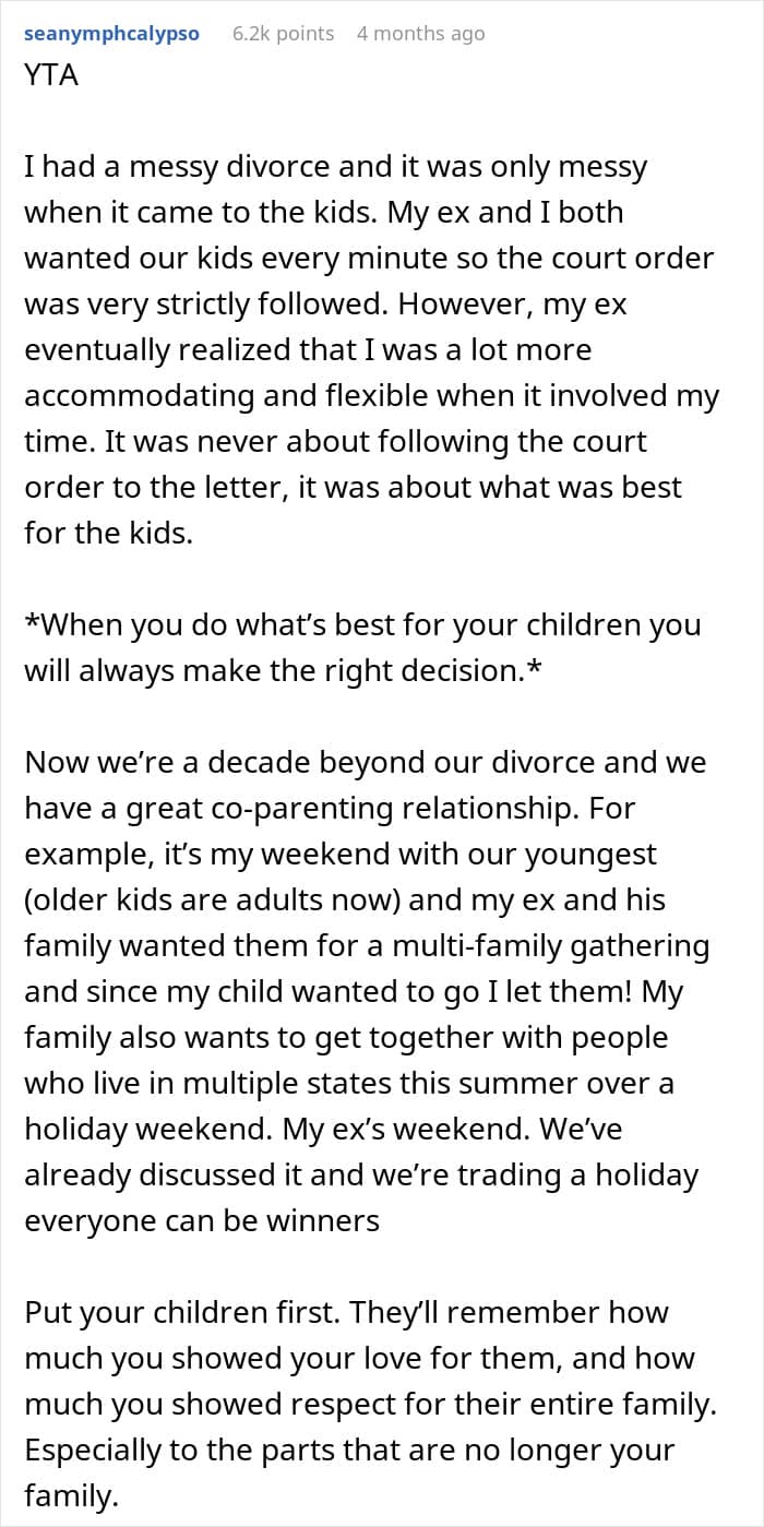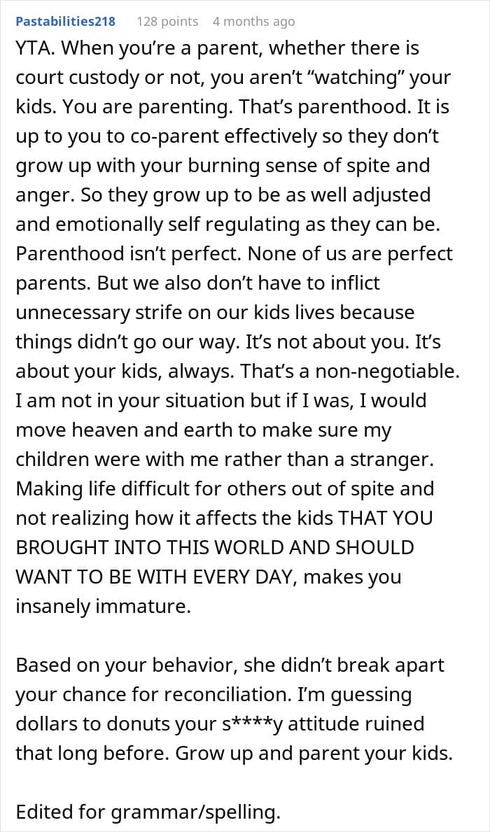 Cooperative co-parenting provides a stable, consistent, and supportive environment. Research shows that it is linked to higher self-esteem, improved academic performance, and better mental health overall in children. So if the author of the post truly cares about her daughters, she should put aside her resentment.