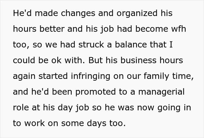 The OP shared that her and her husband have been married for over four years and has two young children. Life was already busy, with her husband juggling both a full-time job and his own business, often working evenings, Saturdays, and sometimes Sundays. Despite the tight schedule, they had previously found a workable balance, allowing for family time and a semblance of normalcy.