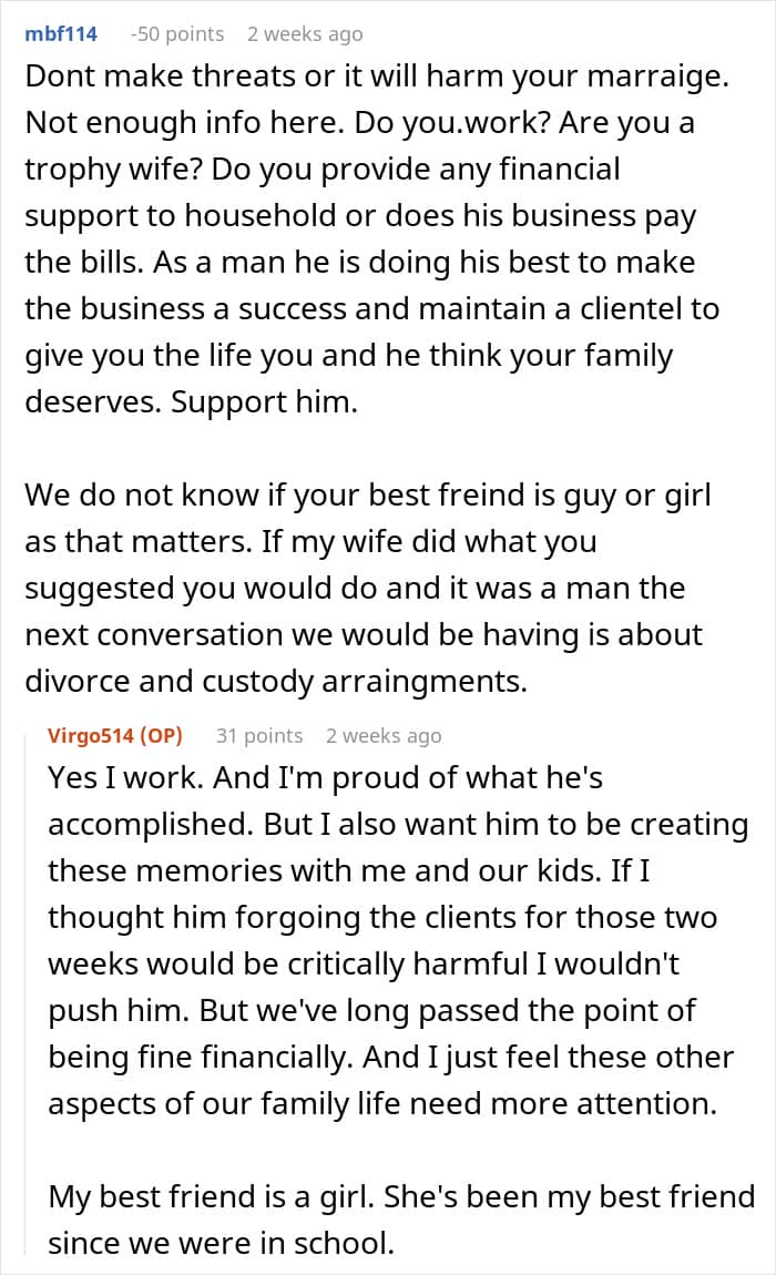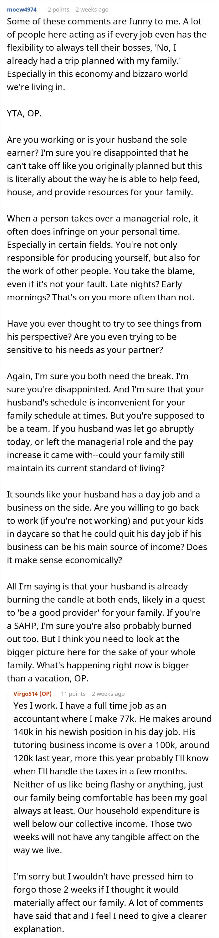 Netizens sided strongly with the OP, emphasizing that she was not being unreasonable and that her husband’s request to postpone the vacation was unfair. They highlighted the importance of family time over work commitments, and also pointed out practical considerations and encouraged her to go on the trip regardless of her husband’s choice.