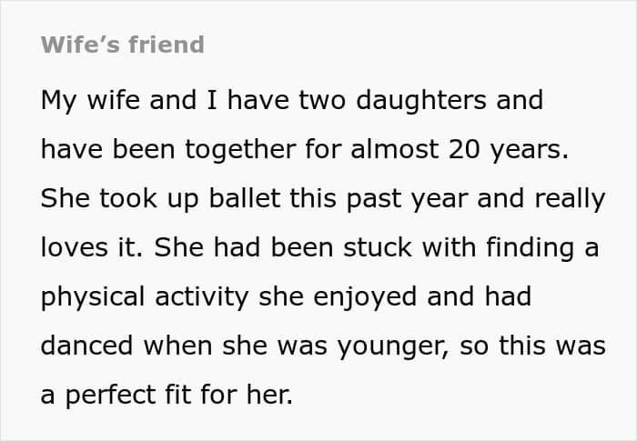 The poster and his wife have been together for 20 years, and recently she took up ballet classes, but got really close with the instructor