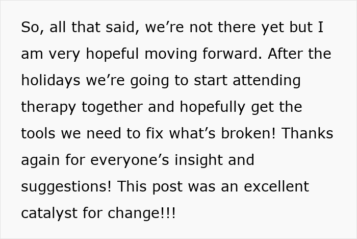 The poster updated that things were looking hopeful for them, and the couple was also going to try therapy to fix what was broken