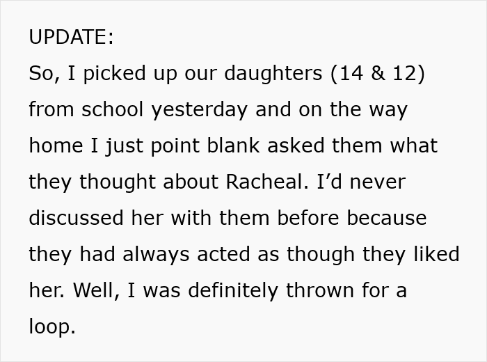 The frustrated poster finally turned to his two daughters (14 and 12 years of age) and asked them what they actually felt about Racheal. He was under the impression that they liked her, but the truth came tumbling out that they didn’t. Even the two felt that the woman was extremely manipulative towards their mom and was trying to steal her away from them.