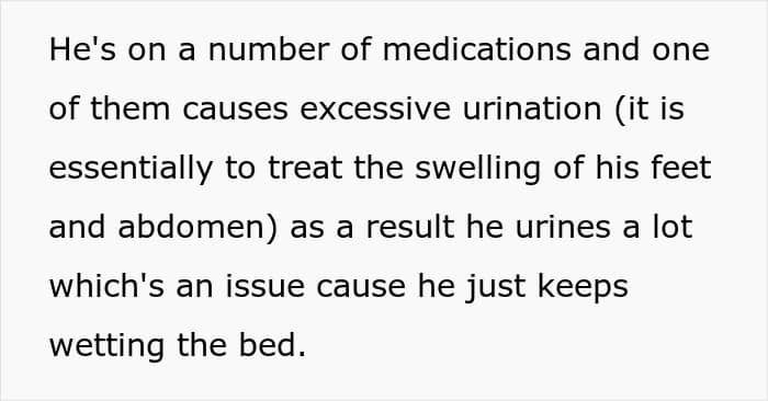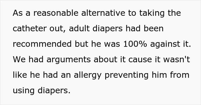 The OP explained that her husband suffered from serious heart problems and depended on her for nearly everything, from cooking, cleaning, managing medication, to watching over his side effects, which included excessive urination, leading to repeated bedwetting incidents. The husband had previously used a catheter, but he chose to have it removed against his doctor’s advice.