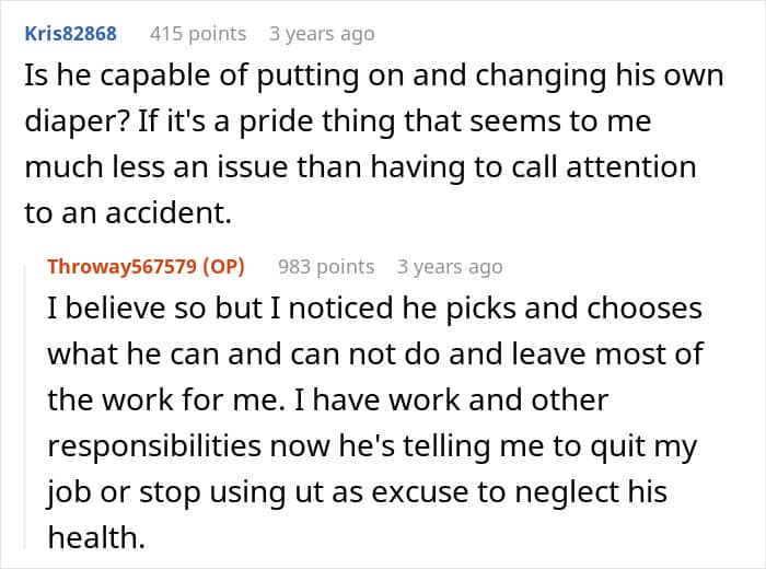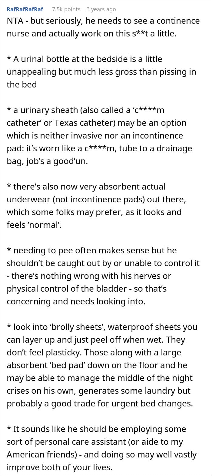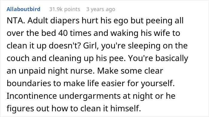Netizens sided with the author, emphasizing that her husband’s refusal to use adult diapers or manage his own bedwetting was unfair and exhausting