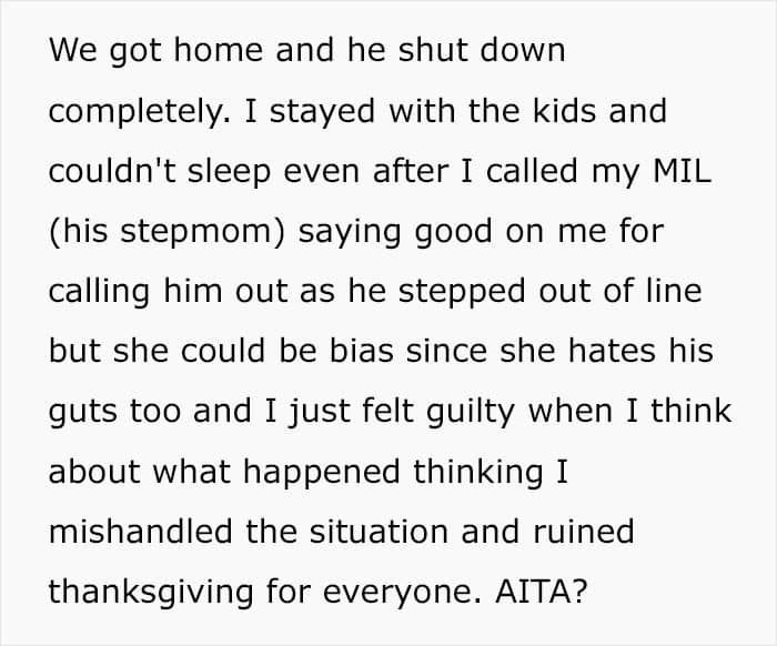 So when you think about it, the husband’s comment and the reaction to her response was really inconsiderate. Storming out and blaming his wife for making things awkward and embarrassing him in front of the whole family raises some serious questions. Not to mention the fact that a few family members do not enjoy his company at all.