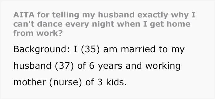 And this Reddit user u/Blatant-Honesty6055 knows it from personal experience. The woman created a post in r/AITA saying that during Thanksgiving dinner, her husband asked why she can’t dance for him every night after work in front of his whole family. Being a mother of three and working as a nurse is already hard enough, so no wonder she took it as a joke.