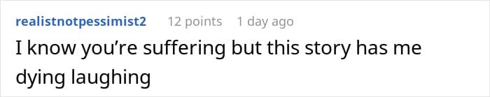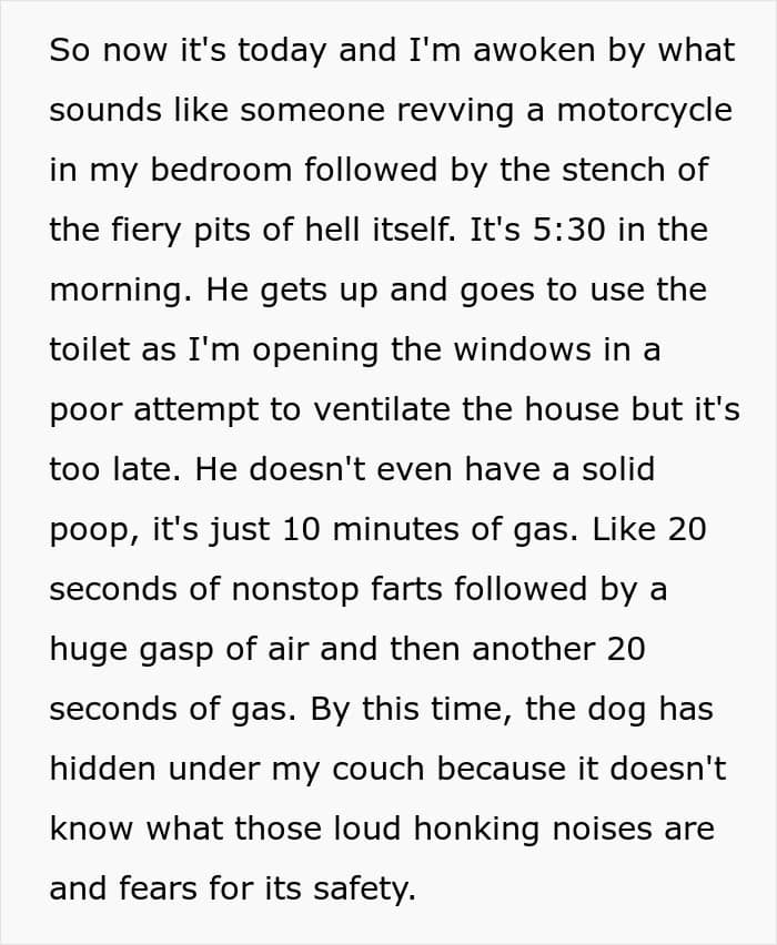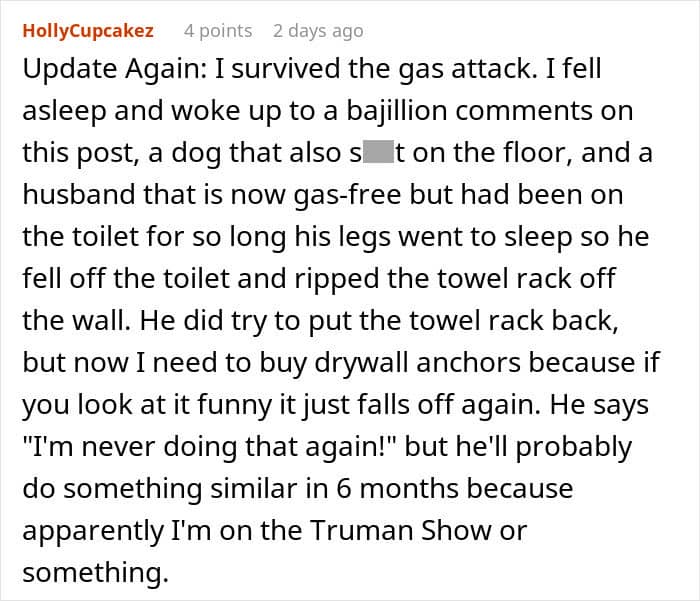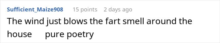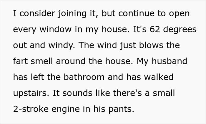 “I posted the story in the wrong subreddit because I meant to post it on r/PointlessStories and not r/Stories because it was a stupid [tale] about my husband’s ongoing gas problems that I think I’ve complained about before.”
