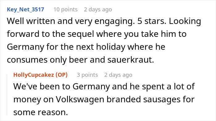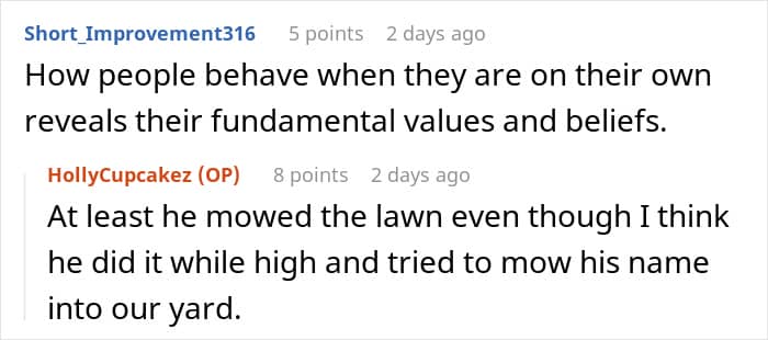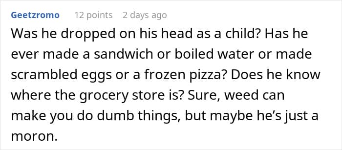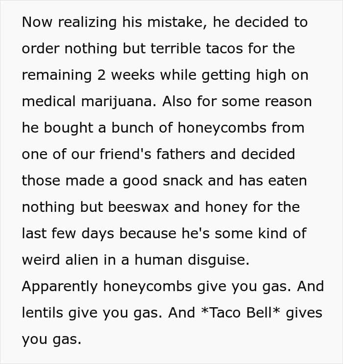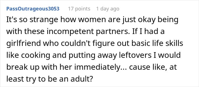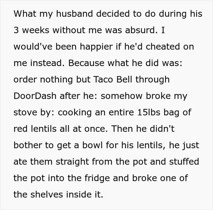 As she was getting ready for the trip, the Redditor thought “he’d either order takeout every day, or eat some of the bulk foods he bought during the last year or so.”