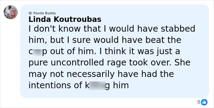 She stabbed him once in the chest and once in the abdomen, inflicting what were later described as life-threatening injuries.