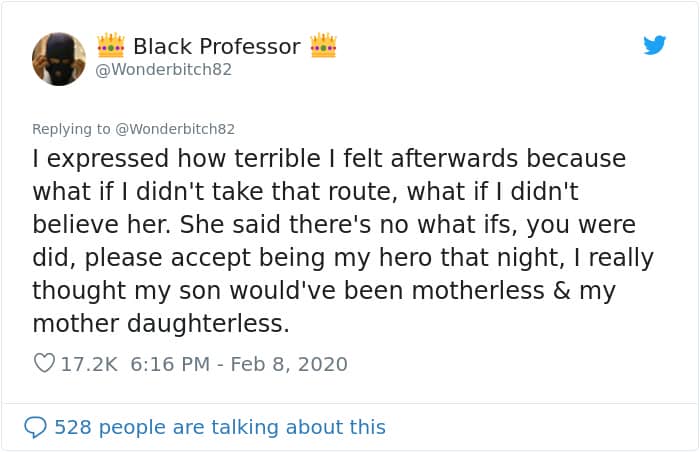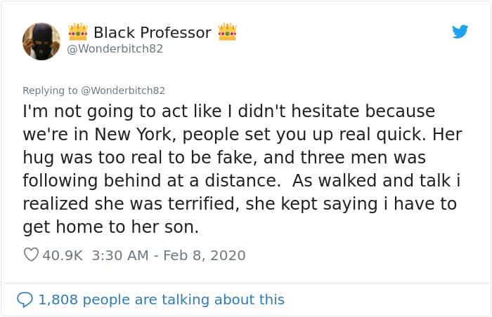 She hurriedly told him to pretend that he knew her, so she could get back home to her son safely. Scroll down to read the full story in the Twitter user’s own words and to realize that there are still everyday heroes among us.